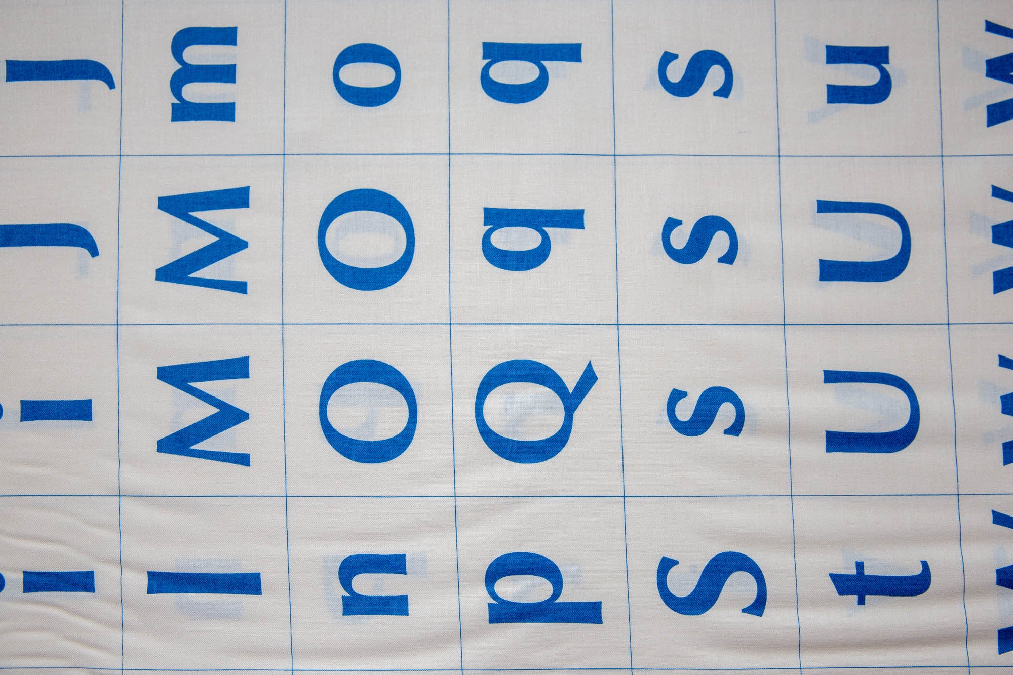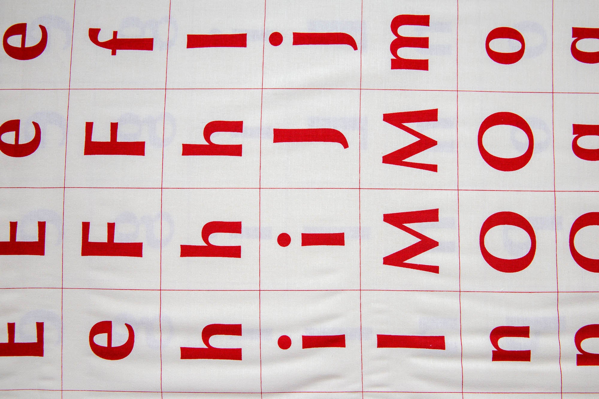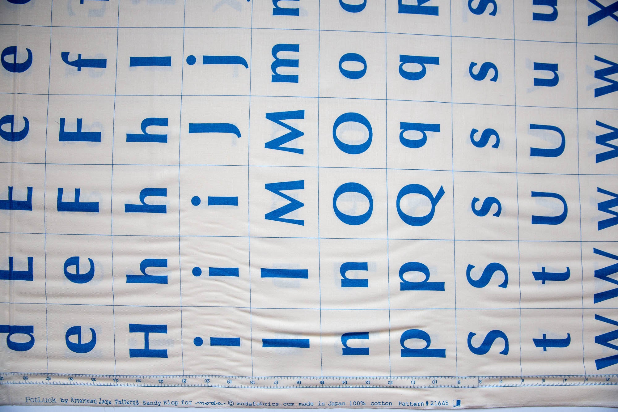 One panel each of Building Blocks in Cream Denim, Cream Licorice, and Cream Cherry; from the Pot Luck Collection, by American Jane, aka Sandy Klop, for Moda Fabrics. These are quilting weight cotton fabrics. This bundle contains a total of 3 panels of fabric. Each panel is 44 inches wide and just slightly over one yard in length. Each panel features all 26 letters of the alphabet in both lowercase and uppercase letters.
