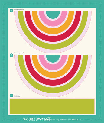 Rainbow Zipper Pouch Panel from the Cut, Sew, Create Collection, by Stacy Iest Hsu, for Moda Fabrics. This is a "Learn to Sew Kit" which includes one cut and sew panel and sewing instructions. This is an intermediate level kit and the focus of this kit is on teaching how to sew a zipper. Panel measures 16 inches by 13.5 inches. Kit includes detailed instructions with illustrations and diagrams. Materials that will be needed to finish the pouch and are NOT included in the kit are lightweight one-sided fusible interfacing, a zipper foot for your machine, and a 12 inch plastic zipper.